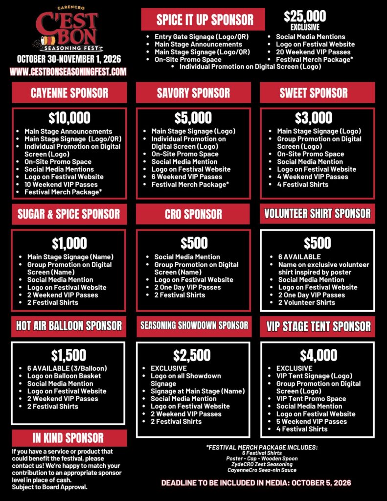 2026 SPONSOR FORM Please enable JavaScript in your browser to complete this form.Please enable JavaScript in your browser to complete this form.SPONSOR NAME *Please type exactly as it is to appear on printed material. CONTACT NAME *MAILING ADDRESS *Address Line 1City--- Select state ---AlabamaAlaskaArizonaArkansasCaliforniaColoradoConnecticutDelawareDistrict of ColumbiaFloridaGeorgiaHawaiiIdahoIllinoisIndianaIowaKansasKentuckyLouisianaMaineMarylandMassachusettsMichiganMinnesotaMississippiMissouriMontanaNebraskaNevadaNew HampshireNew JerseyNew MexicoNew YorkNorth CarolinaNorth DakotaOhioOklahomaOregonPennsylvaniaRhode IslandSouth CarolinaSouth DakotaTennesseeTexasUtahVermontVirginiaWashingtonWest VirginiaWisconsinWyomingStateZip CodePHONE *EMAIL *PLEASE SELECT A SPONSORSHIP LEVEL *SPICE IT UP $25, 000 (Exclusive)CAYENNE $10,000SAVORY $5,000VIP STAGE TENT $4,000 (Exclusive)SWEET $3,000SEASONING SHOWDOWN $2,500 (Exclusive)HOT AIR BALLOON $1,500 (6 available)SUGAR & SPICE $1,000CRO $500VOLUNTEER SHIRT $500 (6 available)Would you like a space for promotional tent at festival (included in sponsor level)? *YesNoWould you like to participate in Trick-or-Treat on October 31 from 6 PM - 8 PM? *YesNoShirt 1 *ASAMALAXLA2XLA3XLShirt 2 *ASAMALAXLA2XLA3XLShirt 3 *ASAMALAXLA2XLA3XLShirt 4 *ASAMALAXLA2XLA3XLShirt 5 *ASAMALAXLA2XLA3XLShirt 6 *ASAMALAXLA2XLA3XLIN KIND (Subject to Board Approval)If you have a service or product that could benefit the festival, please explain here! We’re happy to match your contribution to an appropriate sponsor level in place of cash. Subject to Board Approval.Website / URLPlease include link to website or social media handle here.SPONSOR LOGO Drag & Drop Files, Choose Files to Upload You can upload up to 2 files. Please upload logo. Logo must be received by October 5, 2026 to be included in media.PAYMENT METHOD *Send invoice to pay electronically to email above.Check mailed to C'est Bon Seasoning Fest, P.O. Box 924 Carencro, LA 70520In Kind RequestBy submitting this form, I confirm the above sponsorship commitment, agree to remit payment, and understand that all sponsorship contributions are non-refundable.Submit